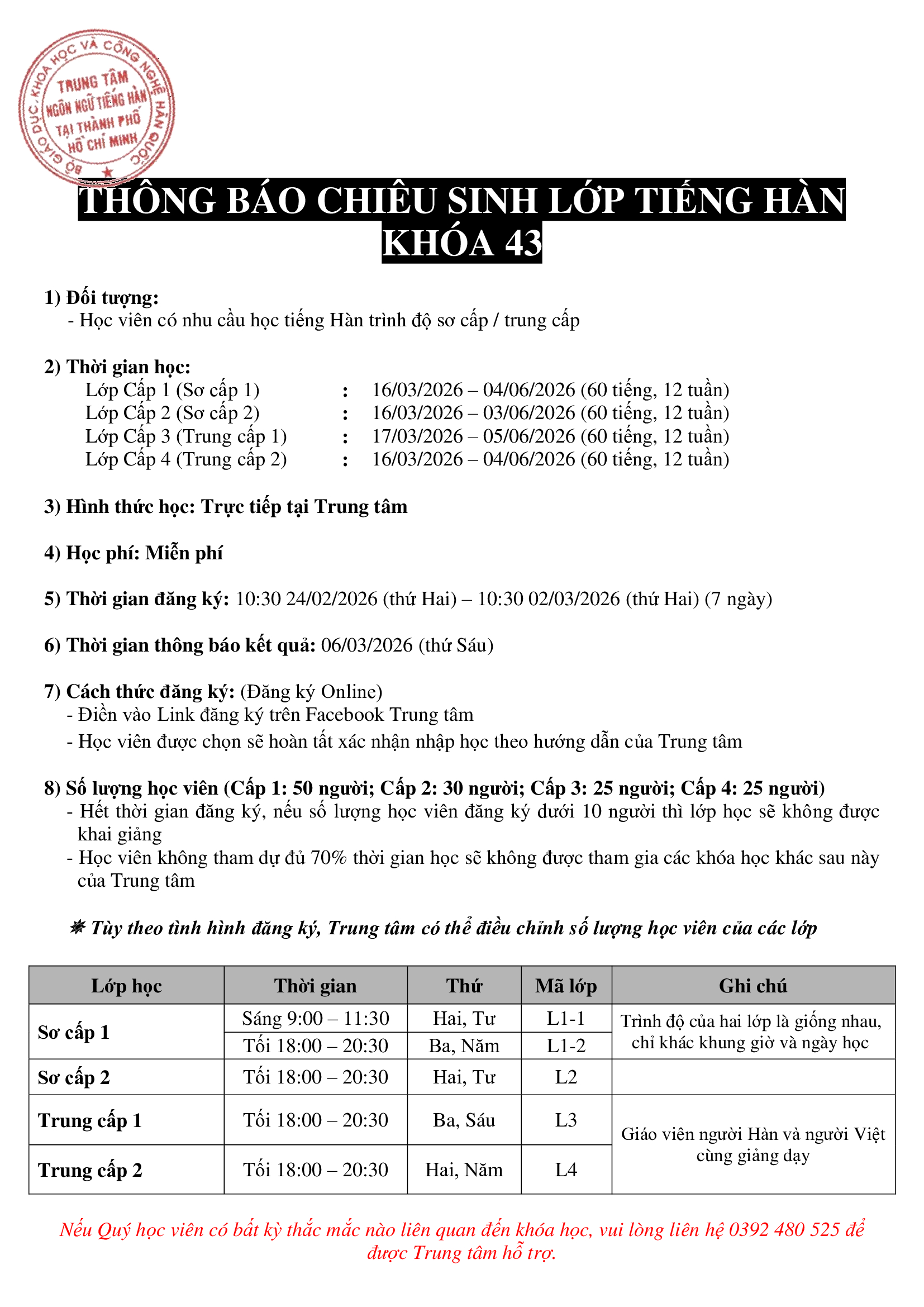 - Lớp Sơ cấp 1 (L1-1): https://forms.gle/ezW5c873q9ojj7GF6 - Lớp Sơ cấp 1 (L1-2): https://forms.gle/SV9mmhU2kUjLAfD78 - Lớp Sơ cấp 2 (L2): https://forms.gle/9PfeiNHSeQtTqkan6 - Lớp Trung cấp 1 (L3): https://forms.gle/U1GNgjAqa3Pi2jWi6 - Lớp Trung cấp 2 (L4): https://forms.gle/a2ScuNkxeQCaRk1FA - Trung tâm chỉ tiếp nhận hồ sơ đăng ký online trong thời gian quy định, không nhận hồ sơ trước hoặc sau thời hạn đăng ký. - Do số lượng học viên mỗi lớp có hạn, Trung tâm áp dụng các tiêu chí tuyển chọn riêng để đảm bảo chất lượng giảng dạy. Quý Anh/Chị vui lòng đọc kỹ thông tin trong form đăng ký và nắm rõ các yêu cầu để hỗ trợ Trung tâm trong quá trình xét tuyển. - Kết quả tuyển chọn sẽ được gửi qua email đã đăng ký. Quý Anh/Chị vui lòng kiểm tra hộp thư thường xuyên và hoàn thiện hồ sơ nhập học theo hướng dẫn khi được thông báo trúng tuyển. Rất mong Quý Anh/Chị tôn trọng quy trình tuyển chọn và phối hợp cùng Trung tâm. Nếu Quý học viên có bất kỳ thắc mắc nào liên quan đến khóa học, vui lòng liên hệ số 0392 480 525 để được Trung tâm hỗ trợ Cám ơn Quý Anh/Chị đã dành thời gian đọc tin.