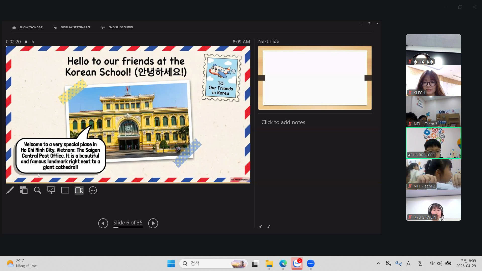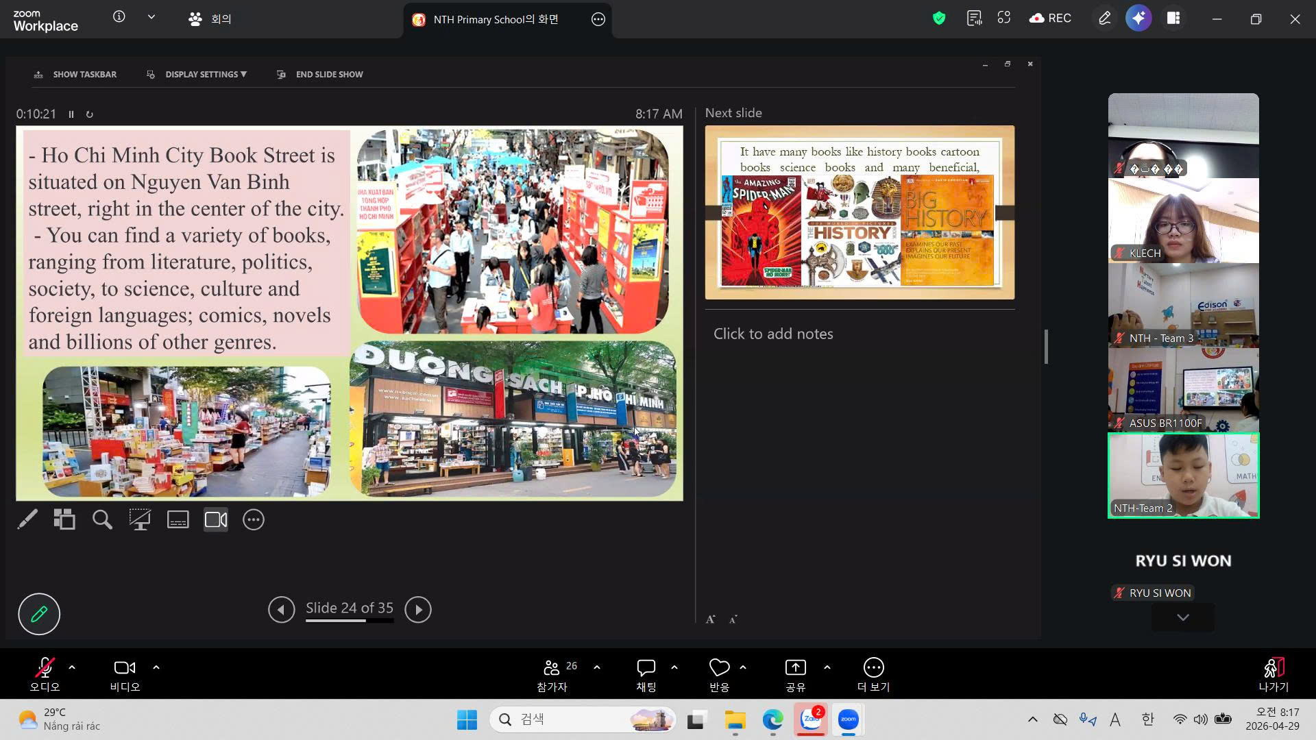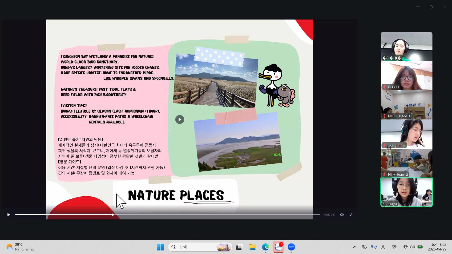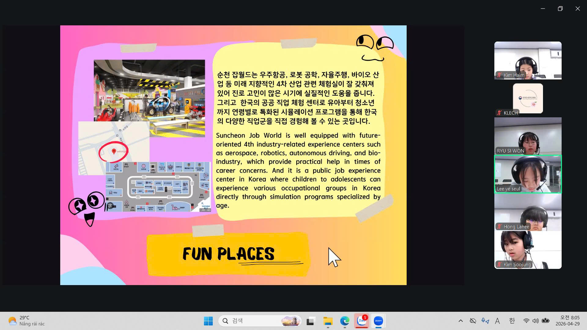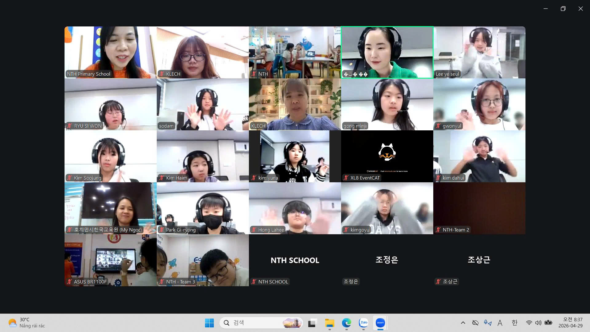 갤러리 (Gallery) 갤러리 디테일 (26.4.29.) 순천동산초-응웬타이혹초 온라인 국제교류 (2차) 작성자 : 관리자 등록일 : 2026-04-29 조회 : 2 이전 (26.4.17.) 태평양대 제2기 한국어 강좌 종강식 다음 다음글이 없습니다 목록으로