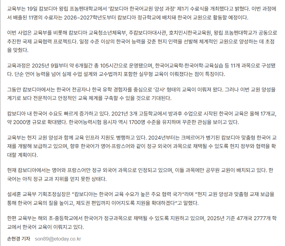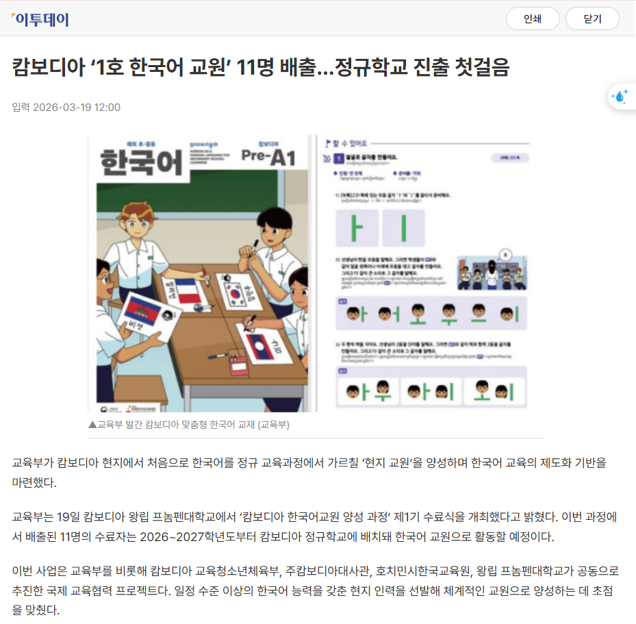 언론보도 (Media Coverage) 언론보도 디테일 (26.3.19. 이투데이) 캄보디아 ‘1호 한국어 교원’ 11명 배출…정규학교 진출 첫걸음 작성자 : 관리자 등록일 : 2026-03-19 조회 : 2 이전 (26.1.8. 하노이외국어대학 뉴스) 2025년 한국어교원양성과정 종강식 다음 (26.3.19. 전자신문) 교육부, 캄보디아 한국어교원 양성…현지 학교서 교육 목록으로