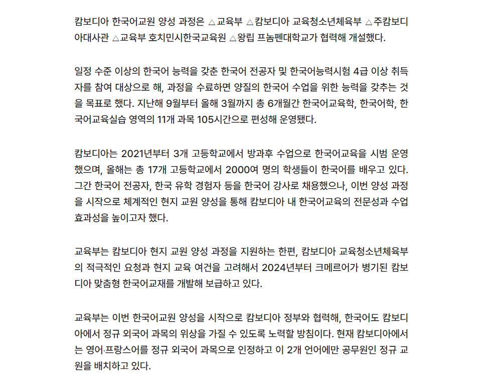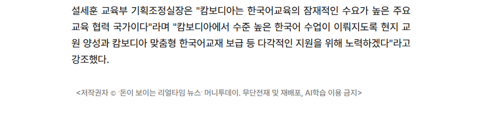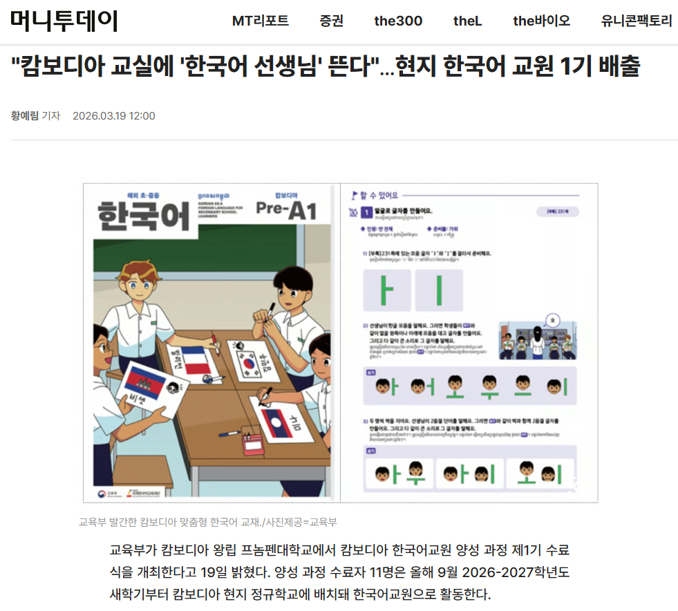 언론보도 (Media Coverage) 언론보도 디테일 (26.3.19. 머니투데이) 캄보디아 교실에 한국어 선생님 뜬다…현지 한국어 교원 1기 배출 작성자 : 관리자 등록일 : 2026-03-19 조회 : 4 이전 (26.3.19. 이투데이) 캄보디아 ‘1호 한국어 교원’ 11명 배출…정규학교 진출 첫걸음 다음 (26.3.19. 전자신문) 교육부, 캄보디아 한국어교원 양성…현지 학교서 교육 목록으로