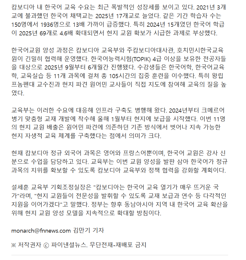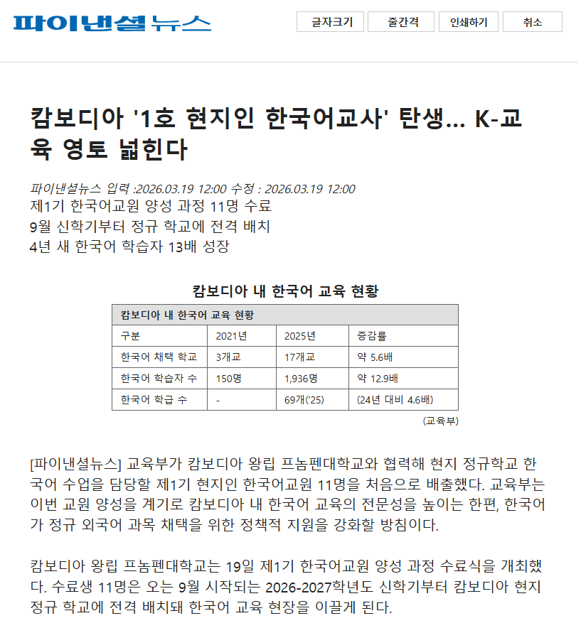 언론보도 (Media Coverage) 언론보도 디테일 (26.3.19. 파이낸셜뉴스) 캄보디아 "1호 현지인 한국어교사" 탄생… K-교육 영토 넓힌다 작성자 : 관리자 등록일 : 2026-03-19 조회 : 8 이전 (26.3.19. TV CHOSUN) 제1기 캄보디아 한국어교원 11명 배출…신학기부터 현지 정규 학교에서 활동 다음 (26.3.19. 전자신문) 교육부, 캄보디아 한국어교원 양성…현지 학교서 교육 목록으로